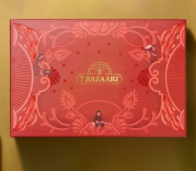 Assorted box with 1 Pisti Truffle, 1 Nutty Pinni Globe, 1 Caramel Crunch Mysore Pak, 1 Mango Kaju Katli Crumble, and 1 Badami.